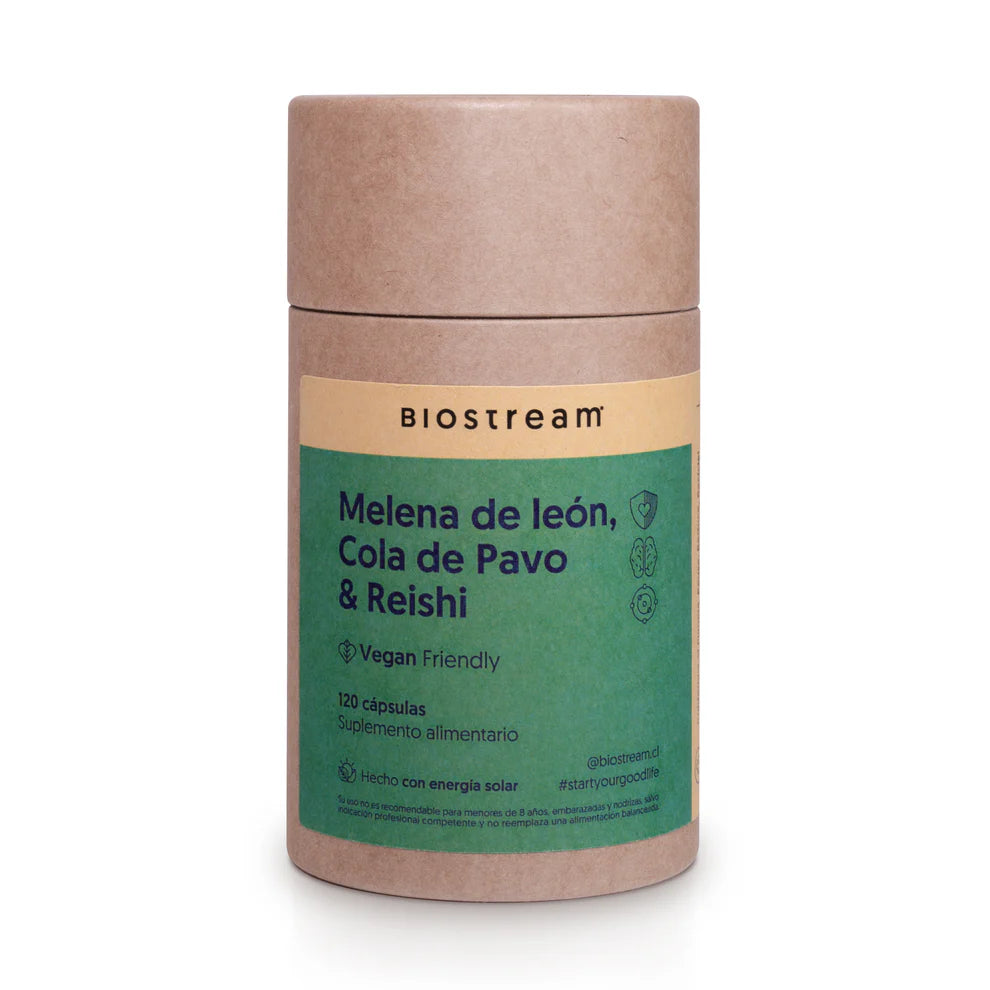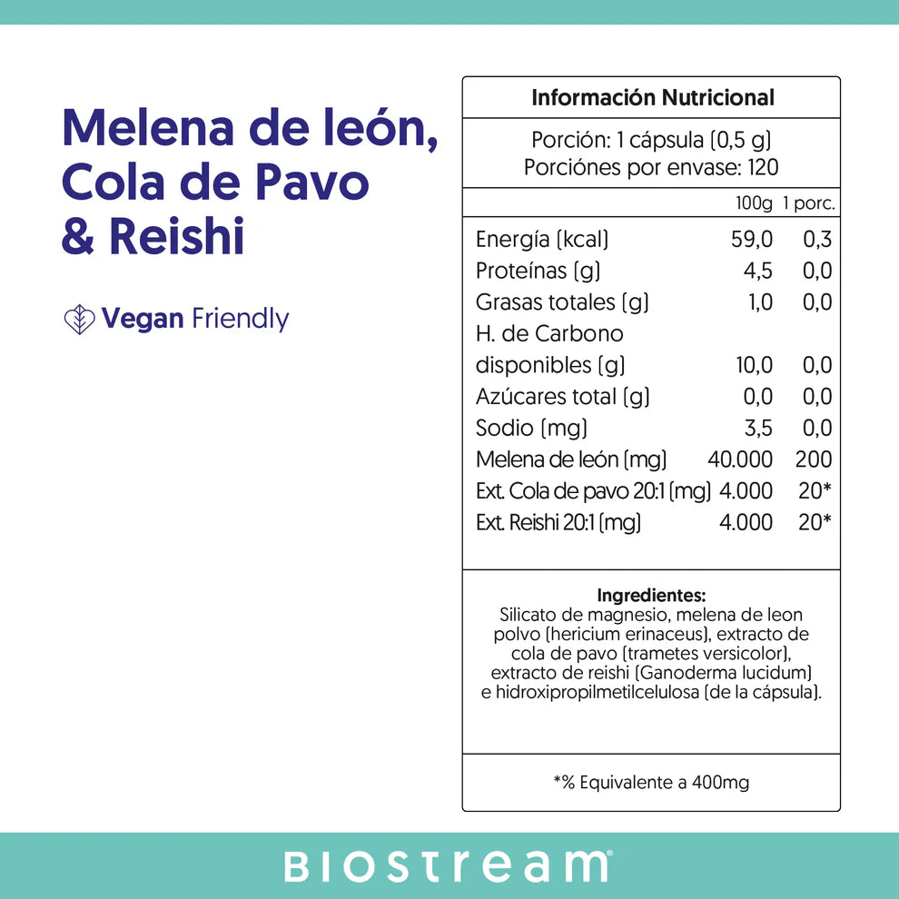 La combinación de Melena de León, Cola de Pavo y Reishi ofrece una potente fórmula natural que apoya la salud cerebral, mejora la memoria y la concentración, y refuerza el sistema inmunológico. Cada uno de estos hongos medicinales tiene propiedades únicas: la Melena de León favorece la regeneración neuronal, el Reishi actúa como un potente antioxidante y la Cola de Pavo ayuda a mantener el sistema inmunológico fuerte. Juntos, proporcionan beneficios excepcionales para la salud mental, la vitalidad general y el bienestar del cuerpo.