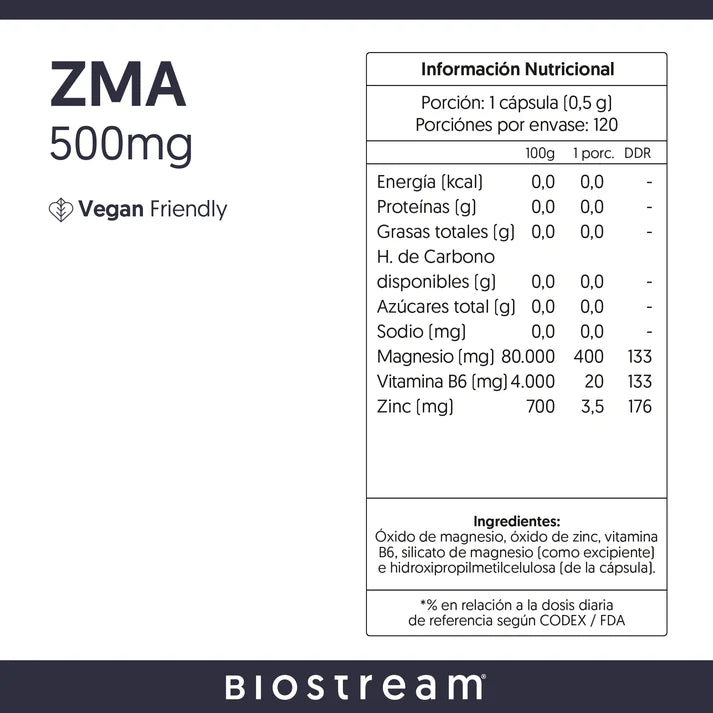 ZMA es una fórmula que combina zinc, magnesio y vitamina B6, diseñada para apoyar la recuperación muscular, mejorar la calidad del sueño y reforzar el sistema inmunológico. Es ideal para quienes buscan optimizar su rendimiento físico y mantener un equilibrio saludable de estos nutrientes esenciales.
